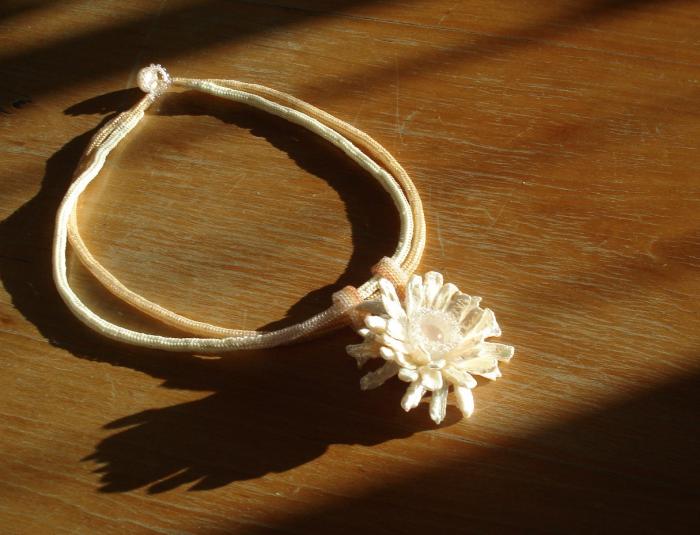 Double stranded herringbone necklace done with Delicas, with a pearl and rose quartz flower pendant, sewn on strong felted wool.